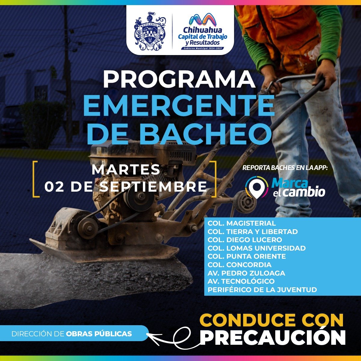 El Gobierno Municipal, a través de la Dirección de Obras Públicas, trabajará con bacheo este 2 de septiembre, mediante el programa emergente, en las colonias Magisterial, Tierra y Libertad, Diego Lucero, Lomas Universidad, Punta Oriente, Concordia, en las avenidas Pedro Zuloaga, Tecnológico y periférico de la Juventud.