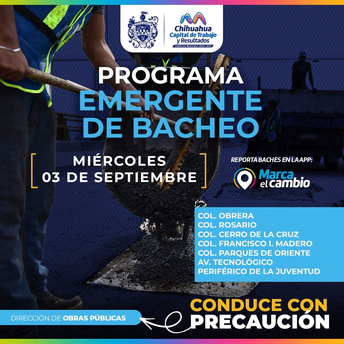 El Gobierno Municipal, a través de la Dirección de Obras Públicas, mediante el programa emergente bacheará este 3 de septiembre calles de las colonias Obrera, Rosario, Cerro de la Cruz, Francisco I. Madero y Parques de Oriente, así como en la avenida Tecnológico y periférico de la Juventud.