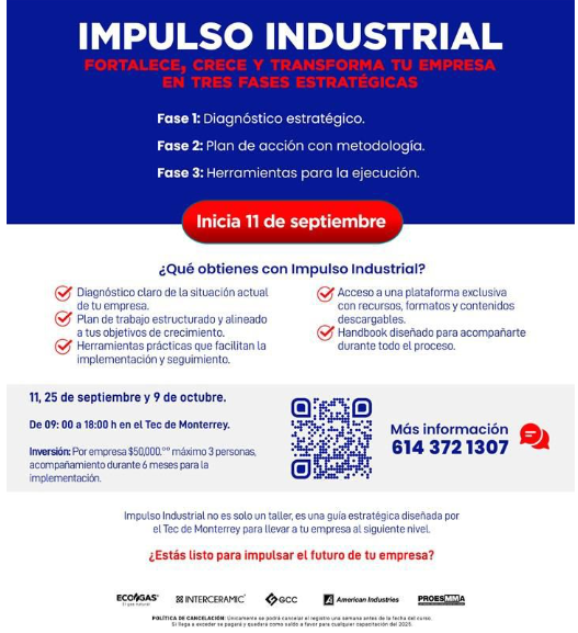 La Cámara Nacional de la Industria de Transformación (CANACINTRA) Chihuahua, presidida por Armando Gutiérrez Cuevas, en alianza con el Tecnológico de Monterrey, presentó el programa Impulso Industrial, una estrategia diseñada para que las empresas de la región fortalezcan su competitividad, crezcan y se transformen mediante tres fases clave: diagnóstico, planeación y ejecución.