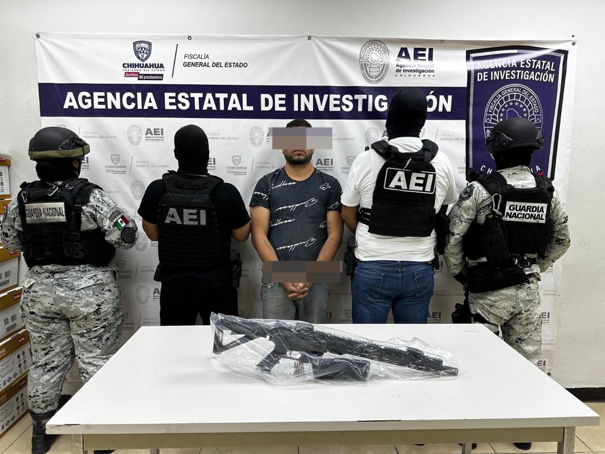 Elementos de la Agencia Estatal de Investigación, adscritos a la Fiscalía de Distrito Zona Norte, en coordinación con el Ejército Mexicano y la Guardia Nacional, detuvieron a un masculino identificado como José Simón J. A., en posesión de un arma de fuego tipo fusil, en la colonia Oasis Oriente de Ciudad Juárez.