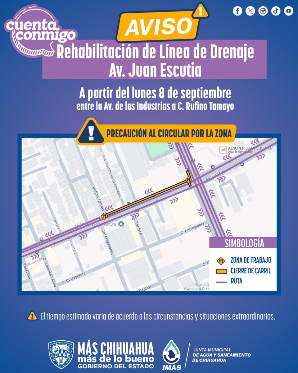 La Junta Municipal de Agua y Saneamiento (JMAS) de Chihuahua informó que este lunes 8 de septiembre, realizará los trabajos de rehabilitación de línea de drenaje en la avenida Juan Escutia, entre De las Industrias y calle Rufino Tamayo.