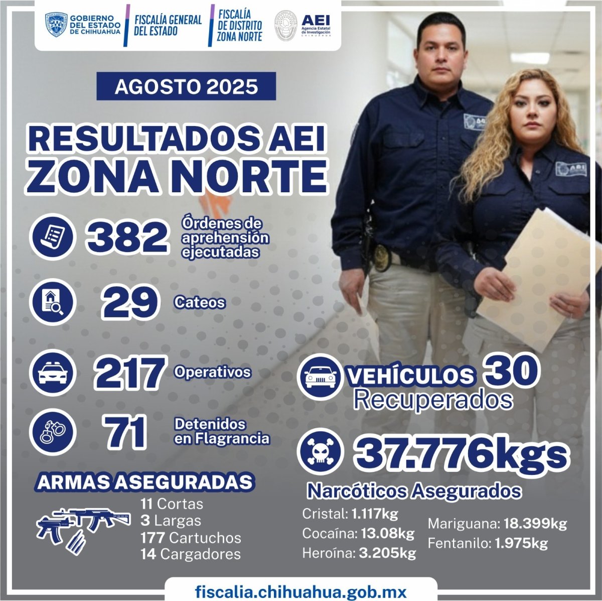 Como resultado del trabajo de investigación y de campo, en el mes de agosto de 2025, elementos de la Agencia Estatal de Investigación (AEI), adscritos a la Fiscalía de Distrito Zona Norte, obtuvieron importantes resultados en el combate al crimen por medio de 217 operativos.