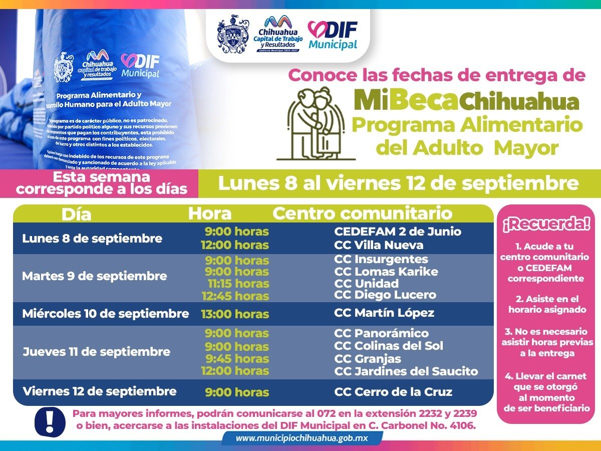 En atención al compromiso que el Gobierno Municipal tiene con las y los adultos mayores de Chihuahua Capital, para garantizarles una mejor calidad de vida, a través del DIF, se informa a las y los solicitantes del Programa Alimentario del Adulto Mayor (PAAM) que podrán acudir por su paquete alimentario, del 8 al 12 de septiembre: