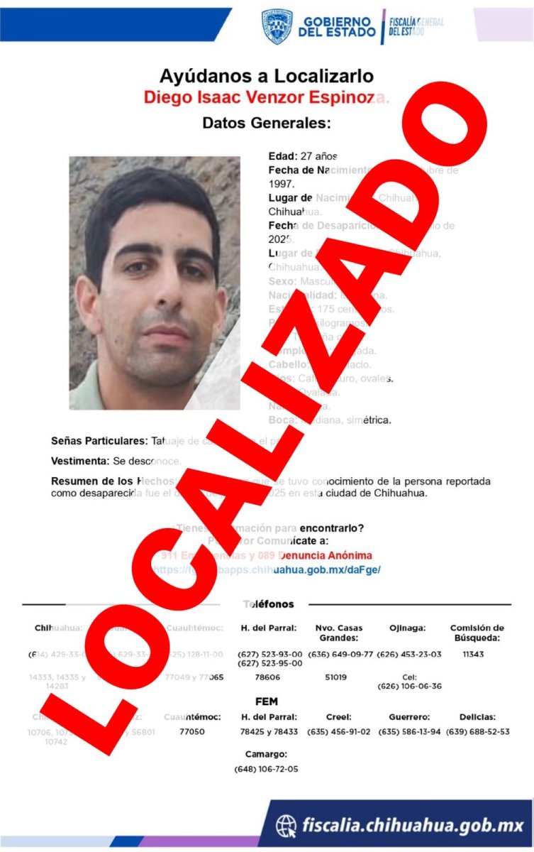 La Unidad Especializada en Investigación de Personas Desaparecidas y/o Ausentes, localizó sano y salvo a Diego Isaac V. E., de 26 años de edad, quien contaba con reporte de desaparición interpuesto el miércoles 3 de septiembre del 2025, en la ciudad de Chihuahua.