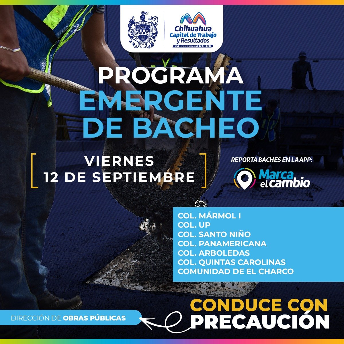 El Gobierno Municipal, a través de la Dirección de Obras Públicas, realizará trabajos de bacheo este 12 de septiembre, mediante el programa emergente, en las colonias Mármol I, UP, Santo Niño, Panamericana, Arboledas y Quintas Carolinas, así como en la comunidad de El Charco.