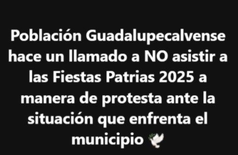 “Población guadalupecalvense hace un llamado a NO asistir a las Fiestas Patrias 2025 a manera de protesta ante la situación que enfrenta el municipio”.