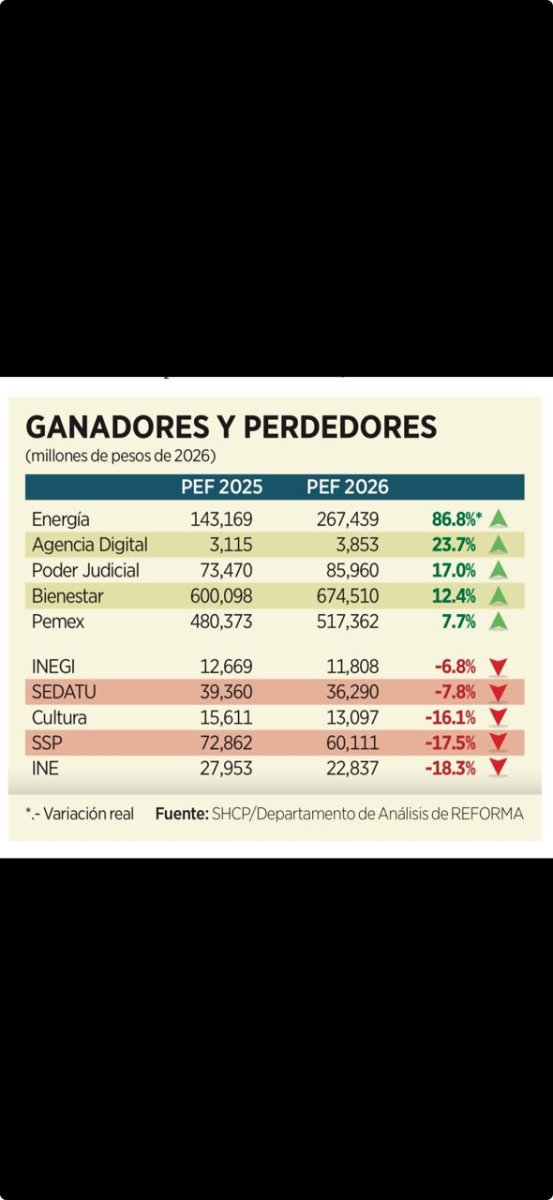 El PEF 2026 deja ver los ganadores y perdedores del gasto público. Energía recibe un aumento histórico de 86.8 %, seguido por Bienestar y el Poder Judicial. En contraste, INE, Seguridad y Cultura sufren recortes de hasta 18 %. El mensaje es claro: el gobierno apuesta por la energía y los programas sociales, pero relega la democracia, la seguridad y la cultura. Una estrategia que privilegia lo inmediato y pone en riesgo pilares fundamentales del país.