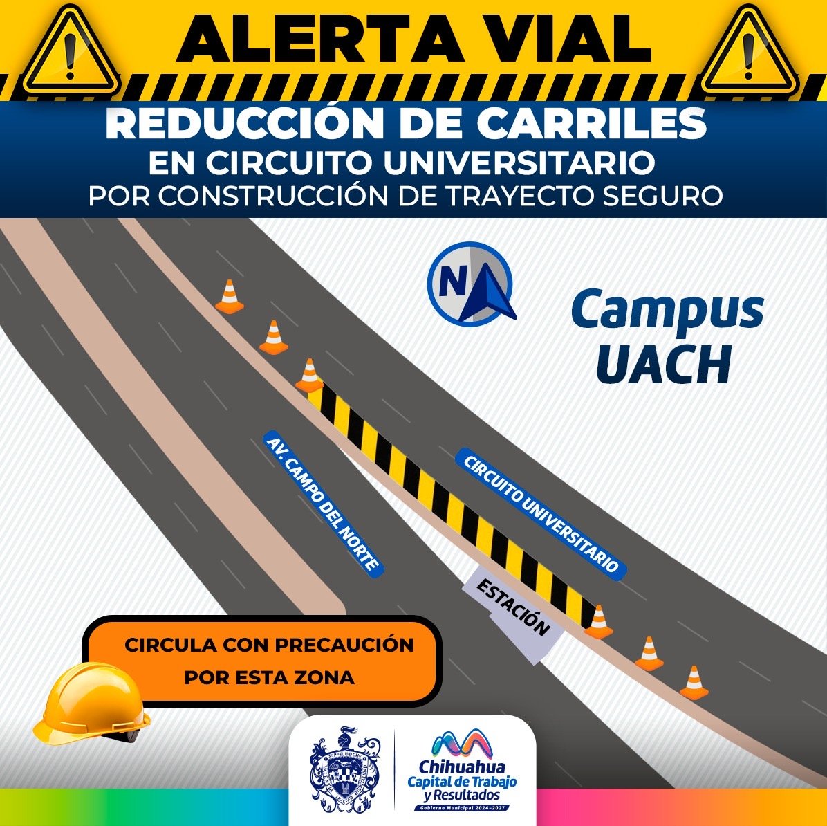 El Gobierno Municipal, a través de la Dirección de Obras Públicas, alerta por la reducción de carriles en el Circuito Universitario a la altura de la avenida Campo del Norte en el sentido norte-sur debido a los trabajos de construcción del trayecto seguro, proyecto ganador del Presupuesto Participativo.