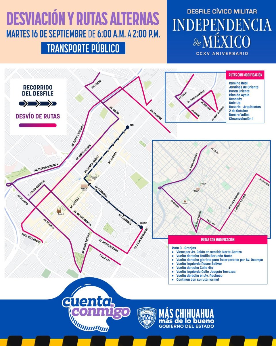 Para el Ruta 3 – Granjas, viene por Av. Colón en sentido Norte-Centro, da vuelta a la derecha Teófilo Borunda Norte, vuelta a la derecha en trebol para incorporarse por Av. Ocampo, vuelta a la izquierda en Paseo Bolívar, vuelta a la derecha en Calle 4ta, vuelta a la izquierda en Calle Joaquín Terrazas, vuelta a la derecha en Av. Pacheco para continuar con su ruta normal. En la ruta de Sur-Centro no se modifica.