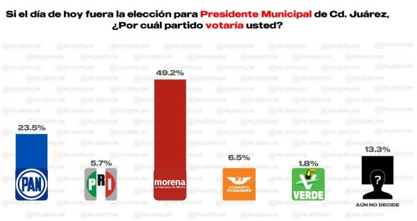 La encuesta Rubrum arroja del sondeo realizado el 13 de septiembre de 2025 a 600 personas vía llamadas telefónicas automatizadas, que Morena mantiene ventaja en preferencias electorales por la Presidencia Municipal de Juárez.