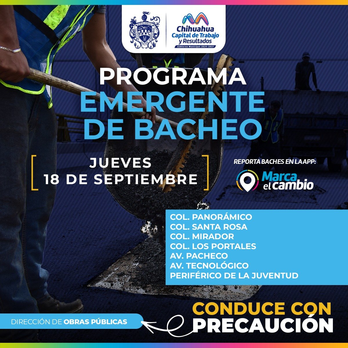 H. Ciudad de Chihuahua, Chih., a 18 de septiembre del 2025.- El Gobierno Municipal a través de la Dirección de Obras Públicas, realizará trabajos de bacheo mediante el programa emergente en las colonias: Panorámico, Santa Rosa, Mirador y Los Portales, así como las avenidas Pacheco, Tecnológico y periférico de la Juventud.