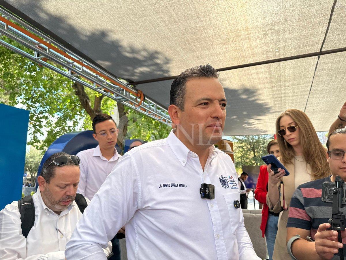 Al buscar tener una conversación con el alcalde Marco Bonilla, acudieron hasta una rueda de prensa en donde encabezaba la presentación del Festival Internacional de Chihuahua, haciéndole varias insignias al respecto.