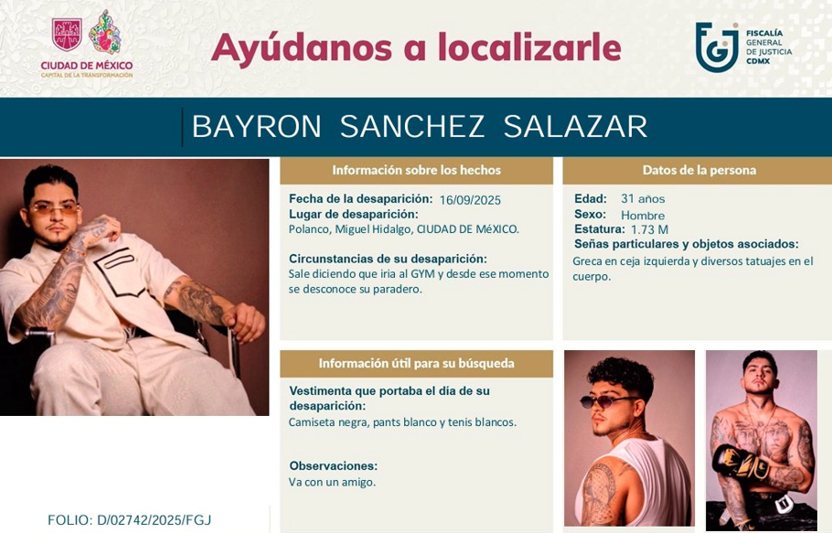 La Comisión de Búsqueda de Personas emitió dos fichas en las que detalló que ambos artistas desaparecieron en la colonia Polanco, alcaldía Miguel Hidalgo. Sobre Bayron Sánchez señaló que “salió diciendo que iría al gimnasio” y desde ese momento se desconoce su paradero.