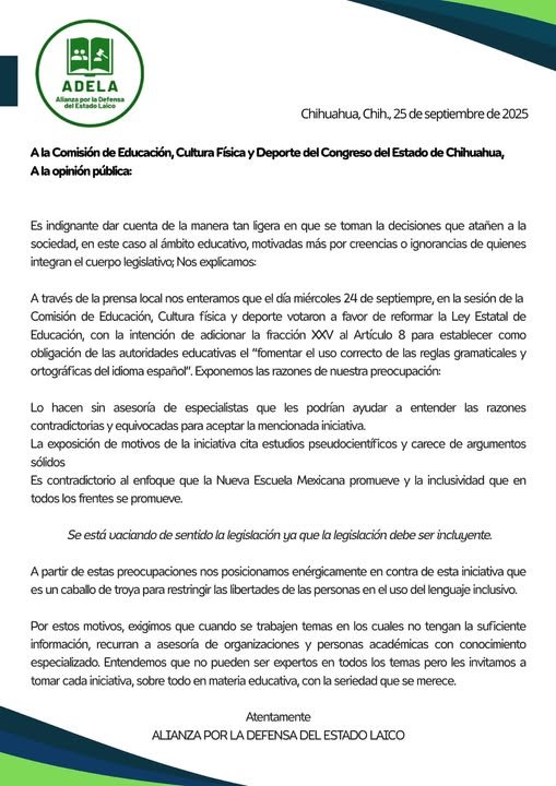 ADELA - Alianza por la Defensa del Estado Laico, se lanza contra los diputados de Morena y PT, por suscribir la propuesta de reforma en defensa de la grámatica en el lenguaje, con la reforma al artículo 8 de la Ley Estatal de Educación, a fin de fomentar el uso correcto de las reglas gramaticales y ortográficas del idioma español.