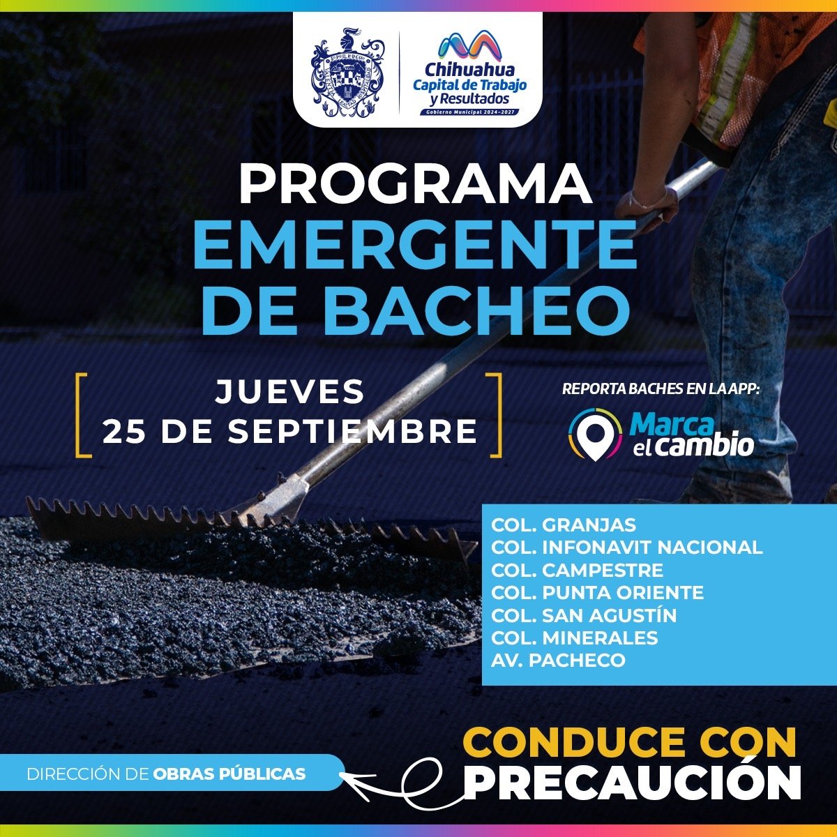 El Gobierno Municipal, a través de la Dirección de Obras Públicas, trabajará con bacheo este 25 de septiembre, mediante el programa emergente, en las colonias Granjas, Infonavit Nacional, Campestre, Punta Oriente, San Agustín y Minerales, así como en la avenida Pacheco.