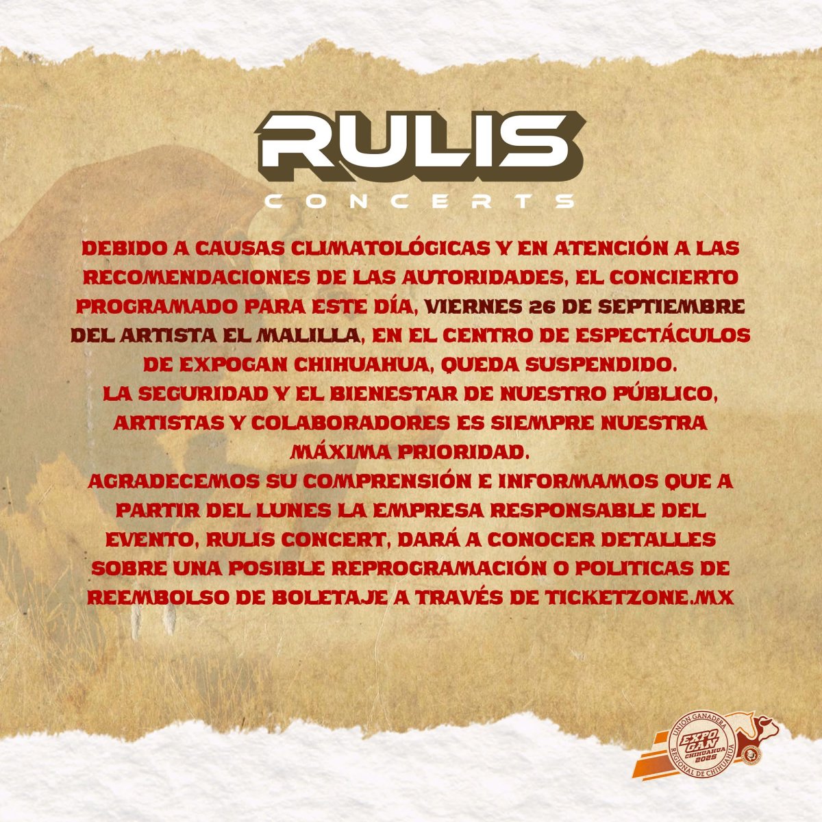 A través de un comunicado se dio a conocer que debido a las causas climatológicas y en atención a las recomendaciones de las autoridades correspondientes, el concierto que estaba programado para este viernes en Expogan 2025 queda cancelado.