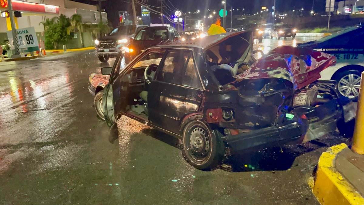 Está noche se registró un aparatoso accidente vial en el cruce de Circuito Universitario y Paseos de la Universidad, en la colonia Paseos de Chihuahua. El percance ocurrió cuando el conductor de un Nissan Tsuru se atravesó de manera intempestiva al paso de una Pick Up Ford F-150, provocando una fuerte colisión.