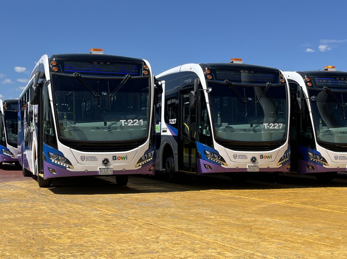 La gobernadora Maru Campos acompañada del secretario general de Gobierno, Santiago de la Peña, hicieron la entrega oficial de 40 nuevos camiones del Sistema de la ruta Bowí con una inversión por unidad de 7.87 millones por unidad es decir un total de 314.8 millones de pesos.