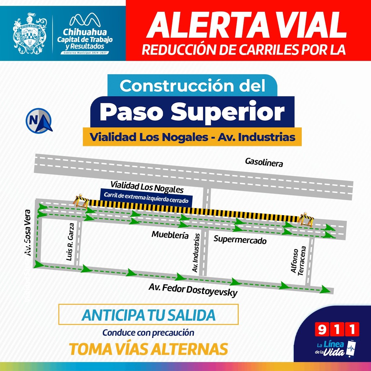 El Gobierno Municipal a través de la Dirección de Obras Públicas, emite un aviso preventivo vial por la reducción de tres a dos carriles en el cuerpo sur de la Vialidad Los Nogales, como parte de las actividades previas a la construcción del Puente Superior Vialidad Los Nogales.