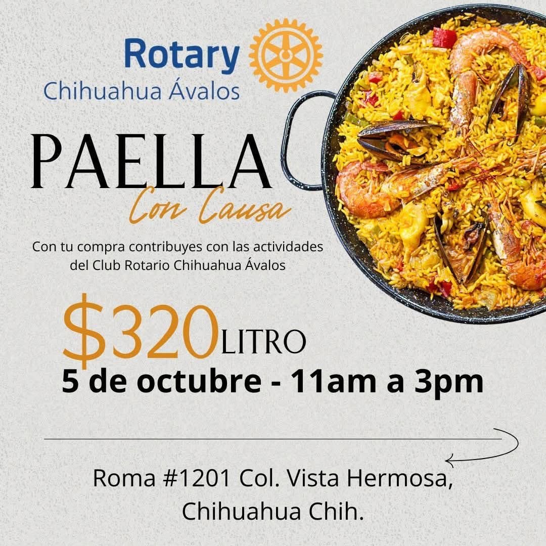 Si usted desea apoyar la labor del Club Rotario Ávalos, no cocine este próximo domingo y acuda a las instalaciones de la organización en la Calle Roma 1201, Colonia Vista Hermosa, en un horario de 11:00 a 15:00. Puede ir apartando su pedido enviando mensaje vía Whatsapp o marcando al teléfono 6141117421. La paella tendrá un costo de $320.00 cada litro.