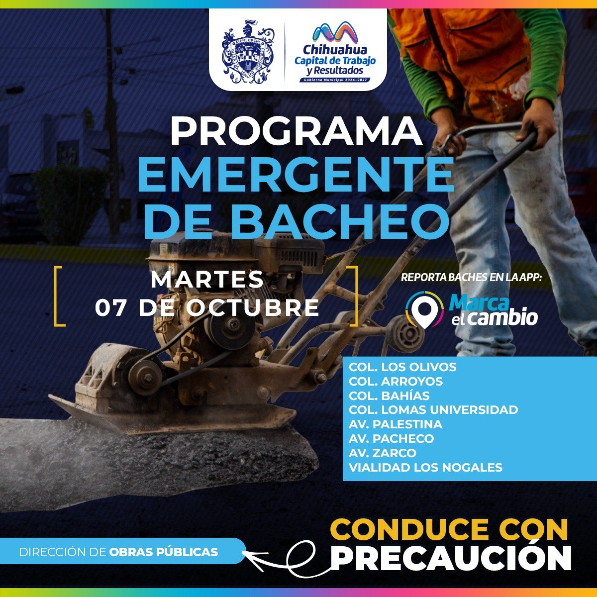 El Gobierno Municipal invita a la ciudadanía a realizar su reporte de bache marcando al 072 en el Centro de Respuesta Ciudadana (CRC), de lunes a viernes de 7:00 am a 8:30 pm, o por medio de la aplicación Marca el Cambio disponible las 24 horas del día.
