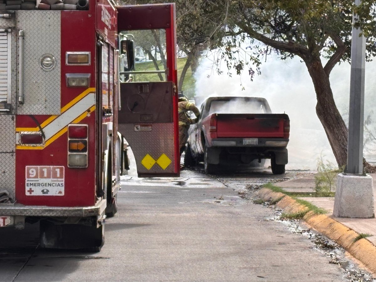 Una pickup Ford Ranger terminó consumida por el fuego luego de que se registrara un cortocircuito cuando era revisada en un taller eléctrico ubicado en la colonia El Palomar.