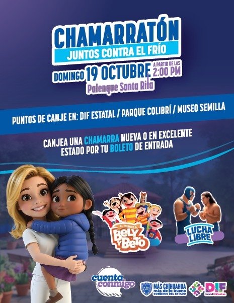 Con un espectáculo del Consejo Mundial de Lucha Libre, el show infantil de Bely y Beto y un Tributo a Selena, el DIF Estatal invita a los chihuahuenses a asistir al primer Chamarratón “Juntos contra el Frío”, este domingo 19 de octubre en el Palenque de la Feria de Santa Rita.