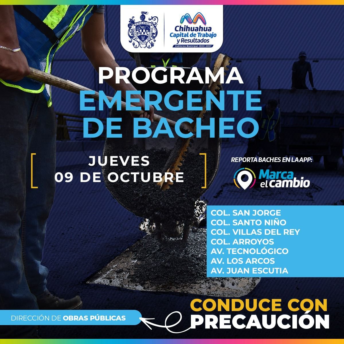 El Gobierno Municipal, a través de la Dirección de Obras Públicas, llevará a cabo trabajos de bacheo este 9 de octubre, mediante el programa emergente, en calles de las colonias: San Jorge, Santo Niño, Arroyos, Villas del Rey, así como en las avenidas Tecnológico, Los Arcos y Juan Escutia.