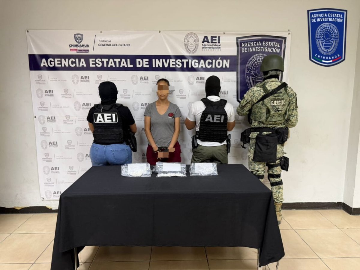 Elementos de la Agencia Estatal de Investigación, adscritos a la Fiscalía de Distrito Zona Norte, en colaboración con el Ejército Mexicano, detuvieron a quien se identificó como Karen Magdalena B. B., por delitos contra la salud, al encontrarse en posesión de mil 62 dosis de cocaína, en hechos registrados en la colonia San Antonio, de Ciudad Juárez.