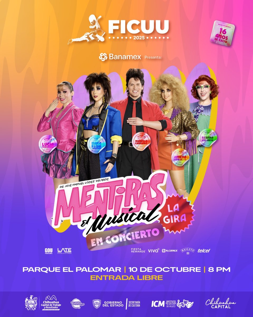 El Gobierno Municipal de Chihuahua, a través del Instituto de Cultura, invita a toda la ciudadanía a disfrutar esta noche del espectáculo “Mentiras, el Musical en Concierto”, como parte de la programación del Festival Internacional de la Ciudad de Chihuahua (FICUU 2025).