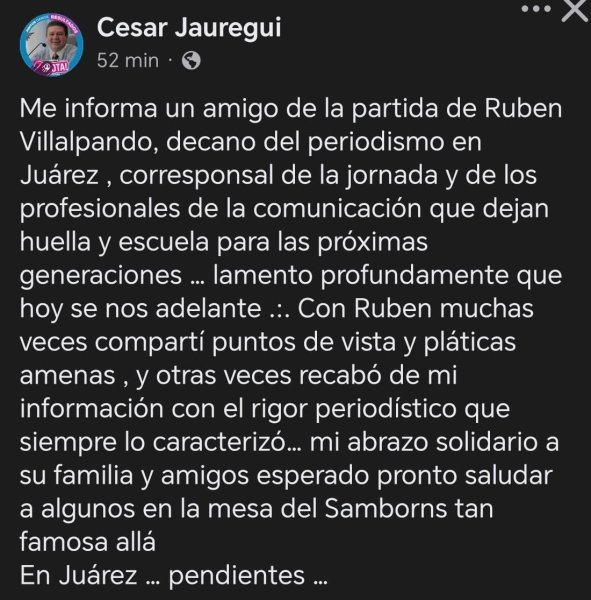 Este domingo, con motivo del fallecimiento del periodista reconocido en la frontera, Rubén Villalpando, el Fiscal General del Estado, César Jáuregui, expresó en redes sociales sus condolenacias, en las que destacó la calidad humana y profesional del comunicador.