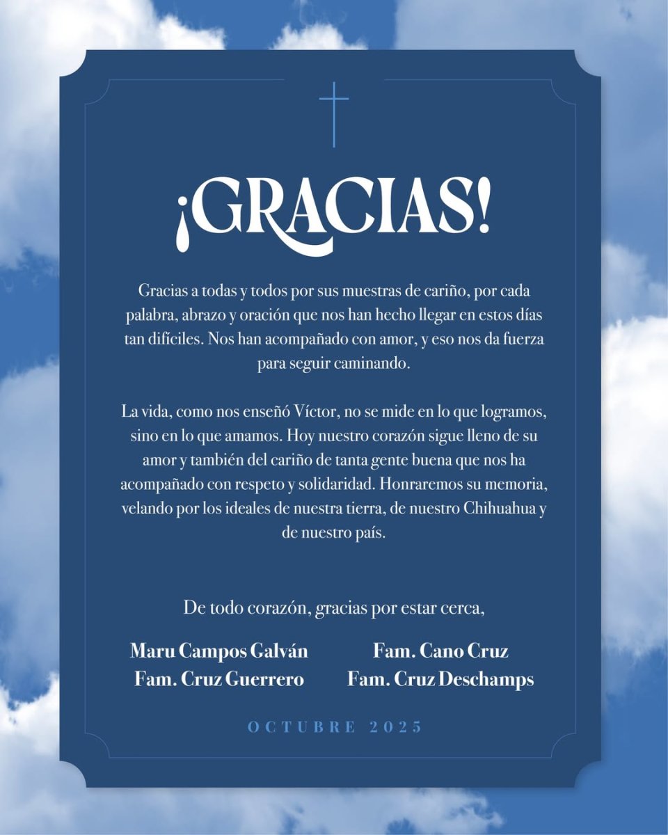 “Nos han acompañado con amor, y eso nos da fuerza para seguir caminando”, se lee en el mensaje firmado por Campos Galván y las familias Cruz Guerrero, Cano Cruz y Cruz Deschamps.