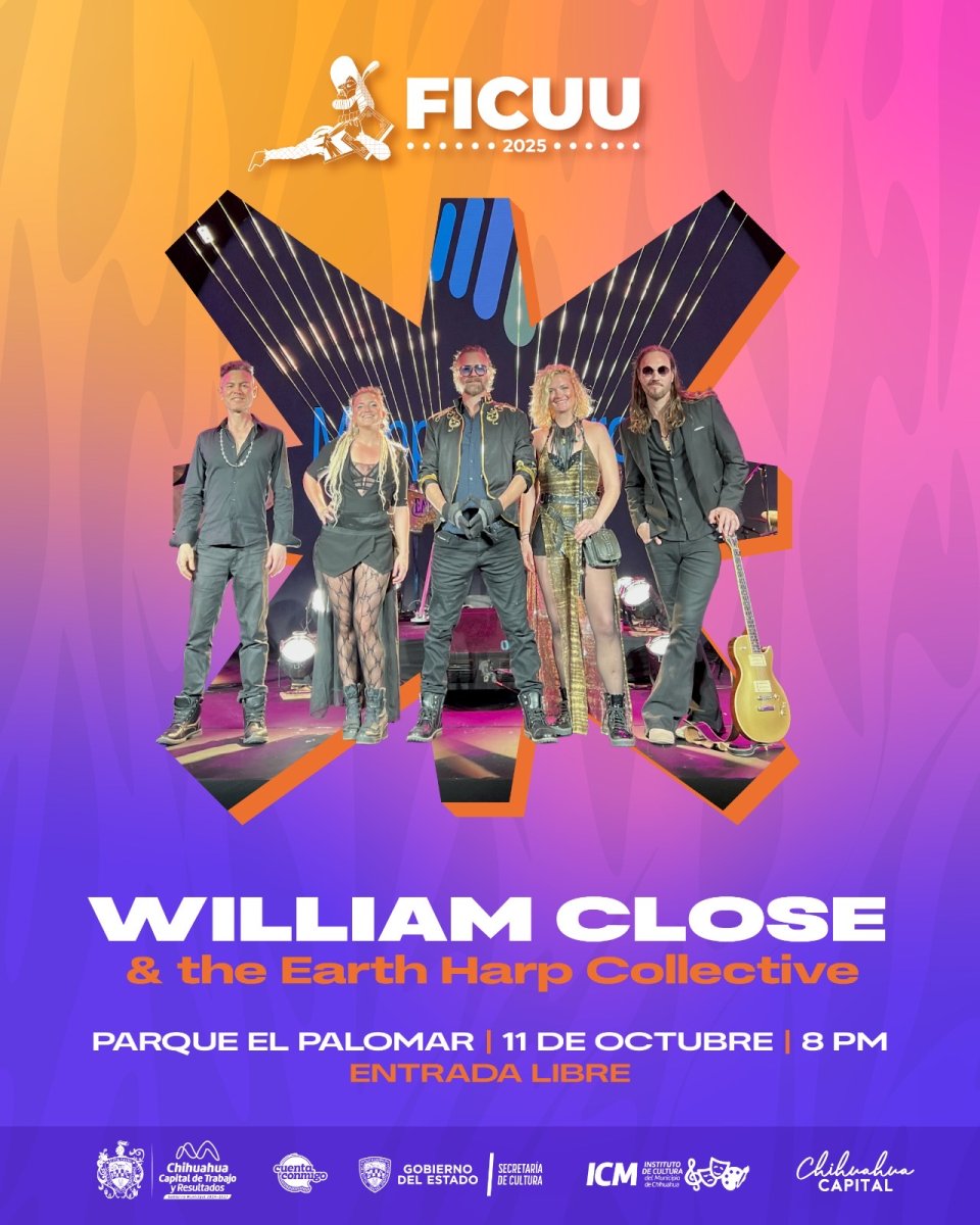 El Gobierno Municipal, a través del Instituto de Cultura del Municipio, invita a todas las familias chihuahuenses a disfrutar esta noche del concierto “William Close & The Earth Harp Collective”, un espectáculo internacional único en su tipo que forma parte de las actividades del Festival Internacional de la Ciudad de Chihuahua (FICUU 2025).