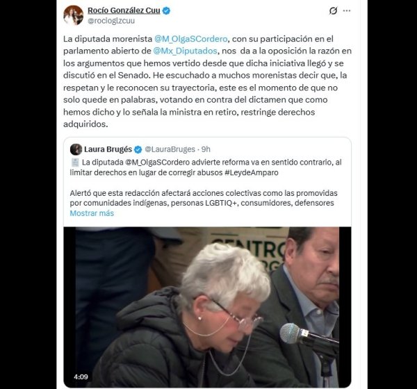 La diputada federal del PAN por Chihuahua, Rocío González, exhibió como la ex ministra de la Corte y ex Secretaria de Gobernación en el gobierno de AMLO, en su participación en el parlamento abierto a la reforma a la Ley de Amparo les otorga la razón a la oposición.