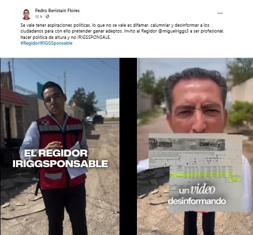 Señaló que políticos irresponsables como Miguel Riggs se dedican a calumniar y mal informar a los ciudadanos con intereses electorales, "te vamos a llamar en el PRI el regidor iRiggsponsable. Porque lo único que haces es calumniar, difamar y mentir, repito, para ganar adeptos. Te invitamos a que seas más responsable, a que seas más profesional, a que hagas política de altura, pero sobre todo que no le mientas a las y los chihuahuenses porque es lo último que se merecen de políticos como tú".