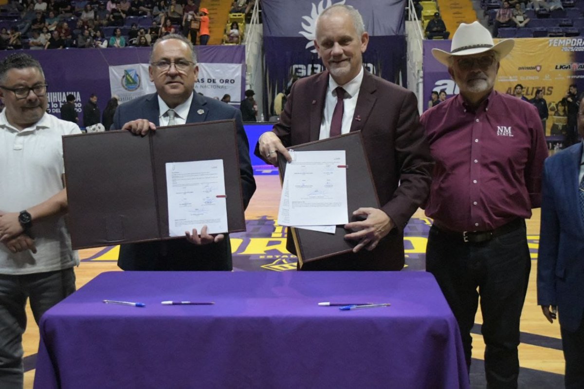 Durante el encuentro deportivo binacional de básquetbol entre los Dorados de la Universidad Autónoma de Chihuahua y los Aggies de la New Mexico State University, se llevó a cabo la firma de un convenio de colaboración académica que permitirá ofrecer programas de doble titulación en áreas del sector agropecuario.