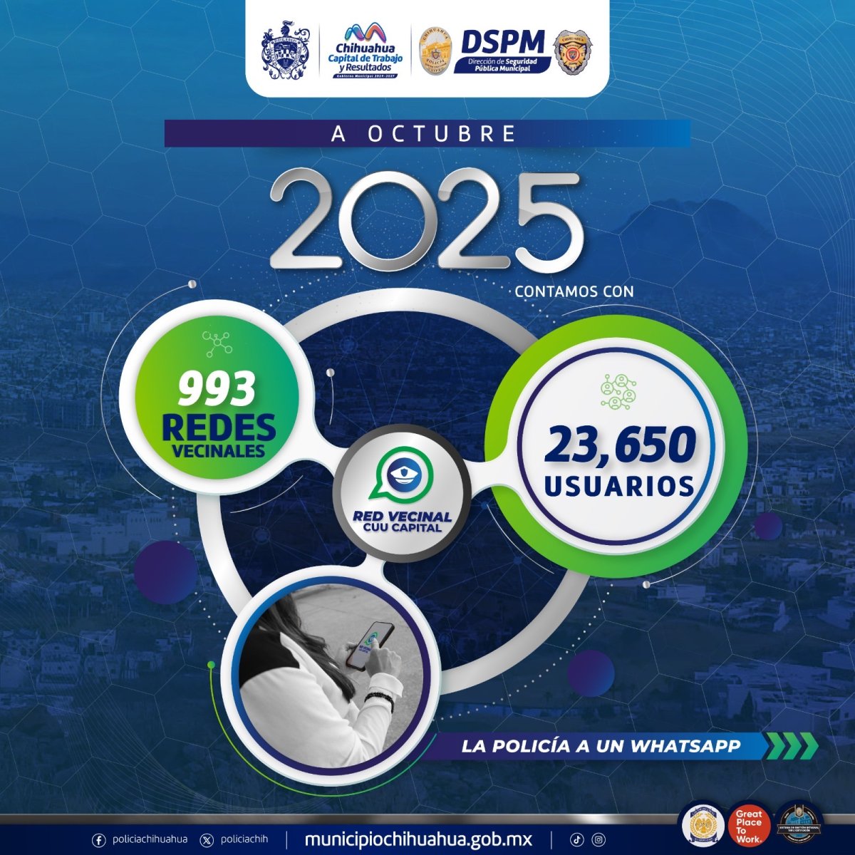 El programa Red Vecinal de la Dirección de Seguridad Pública Municipal (DSPM) continúa creciendo en la ciudad y al mes de octubre tiene 993 grupos activos y más de 23 mil 650 vecinos registrados que utilizan esta opción para mantener una comunicación rápida y directa con la Policía Municipal.