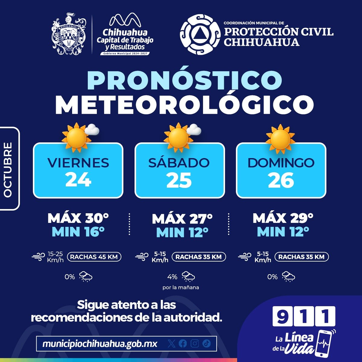 El Gobierno Municipal de Chihuahua, a través de la Coordinación Municipal de Protección Civil, informa que para este fin de semana se esperan condiciones mayormente soleadas, vientos moderados y muy baja probabilidad de lluvia.