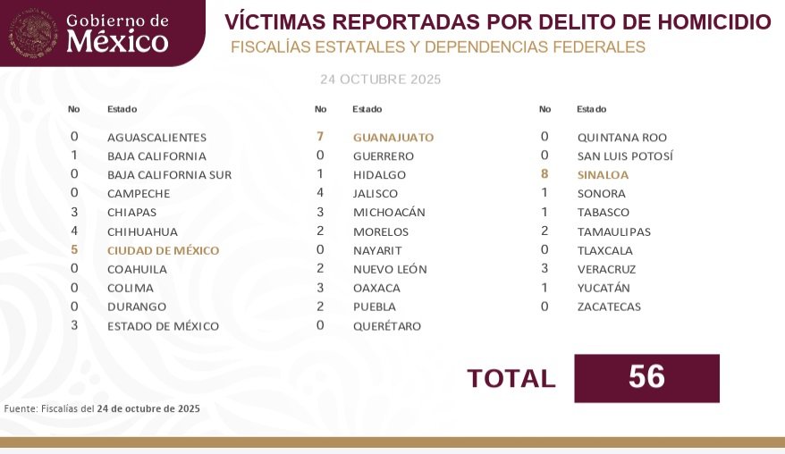 De acuerdo con el informe, la lista la encabeza Sinaloa con ocho homicidios, seguida de Guanajuato con siete, Ciudad de México con cinco y Chihuahua con cuatro, mientras que 13 estados no reportaron muertes violentas.