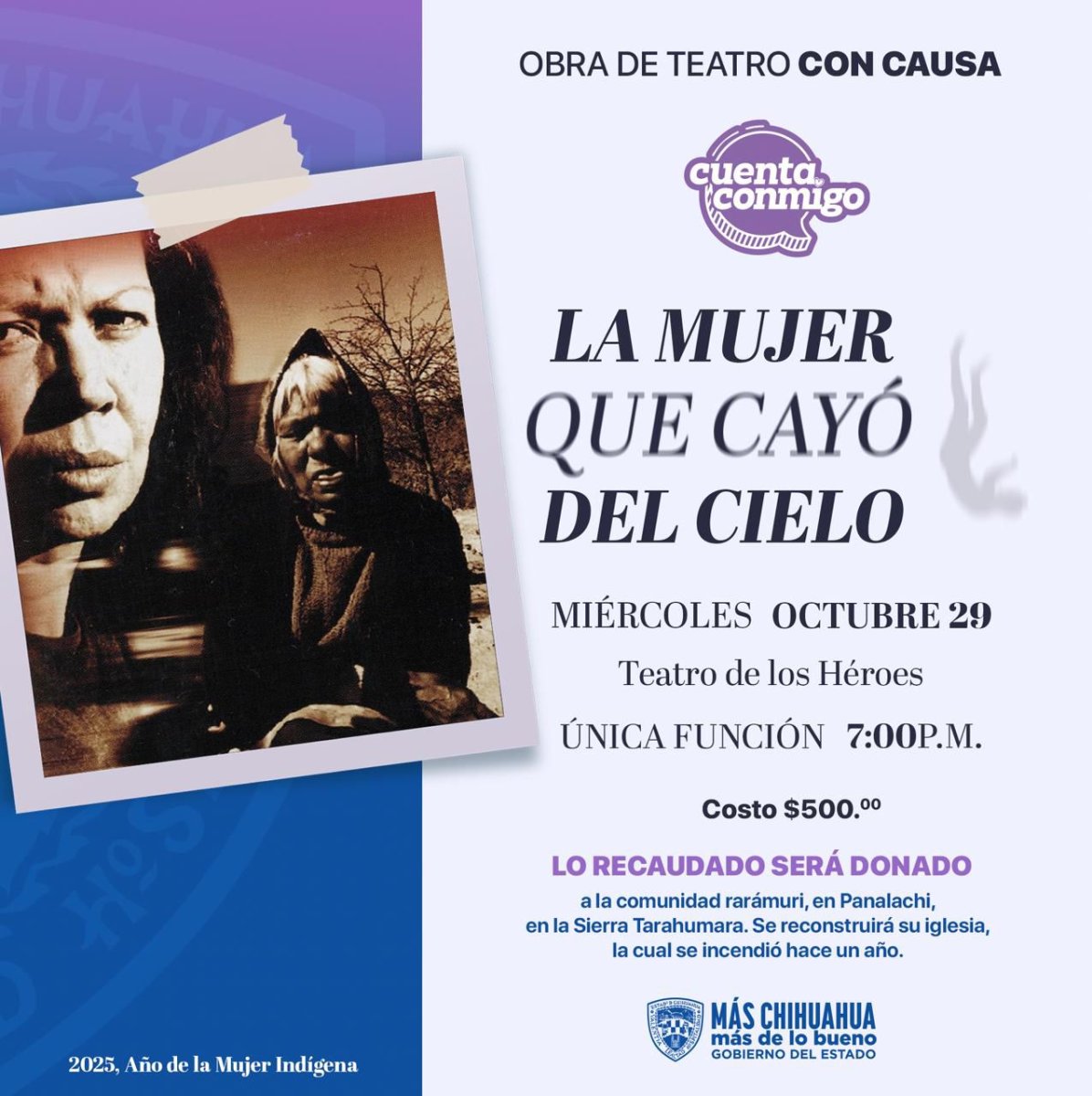 Este miércoles 29 de octubre se presentará en el Teatro de los Héroes la obra “La mujer que cayó del cielo”, cuya función será a beneficio de la reconstrucción de la iglesia del Sagrado Corazón de Jesús, ubicada en la comunidad de Panalachi, municipio de Bocoyna.