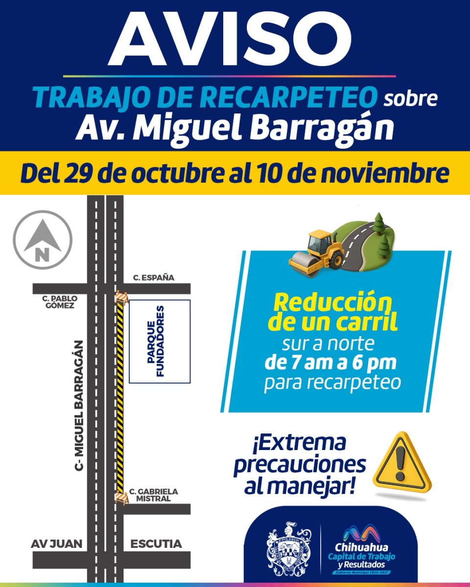 El Gobierno Municipal, a través del Consejo de Urbanización Municipal (CUM), emite una alerta vial por los próximos trabajos de recarpeteo en el tramo de la avenida Miguel Barragán que abarca de la calle Gabriela Mistral hasta la calle España, de Sur a Norte, por lo que se exhorta a la ciudadanía a circular con precaución por el sector.