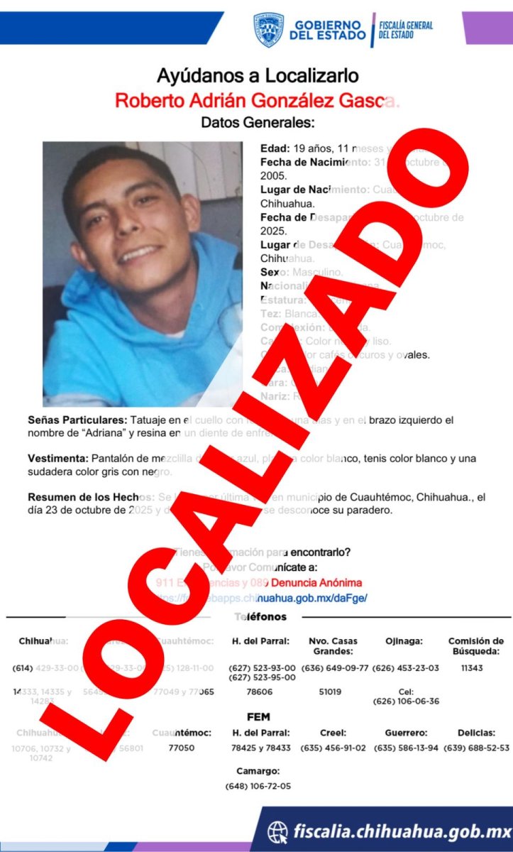 Agentes de la Unidad de Investigación de Personas Desaparecidas, localizaron a Roberto Adrián G. G., persona de 19 años de edad, quien el 23 de octubre de 2025 salió de su domicilio en colonia Los Nogales.