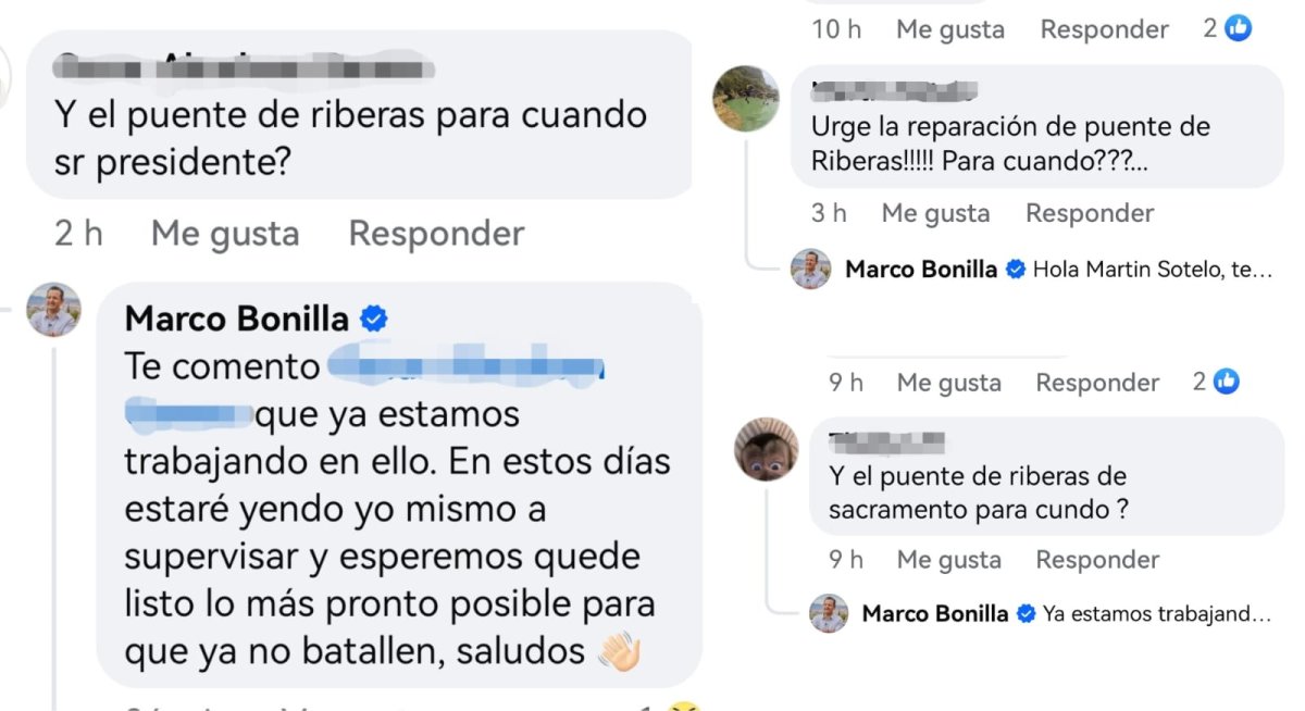 En una serie de comentarios en una publicación del mismo Bonilla,en donde informa sobre avances en cambio de carpeta asfáltica en el inicio de la carretera Chihuahua-Cuauhtémoc, ciudadanos solicitaron que de favor se arregle este puente, que ya tiene varios meses afectado, a lo que el alcalde respondió que ya se trabaja en los arreglos de infraestructura.