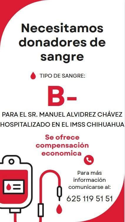 Amigos y familiares del señor Manuel Alvidrez Chávez solicitaron donadores de sangre tipo B- de manera urgente, quién se encuentra hospitalizado en el hospital Morelos del IMSS.