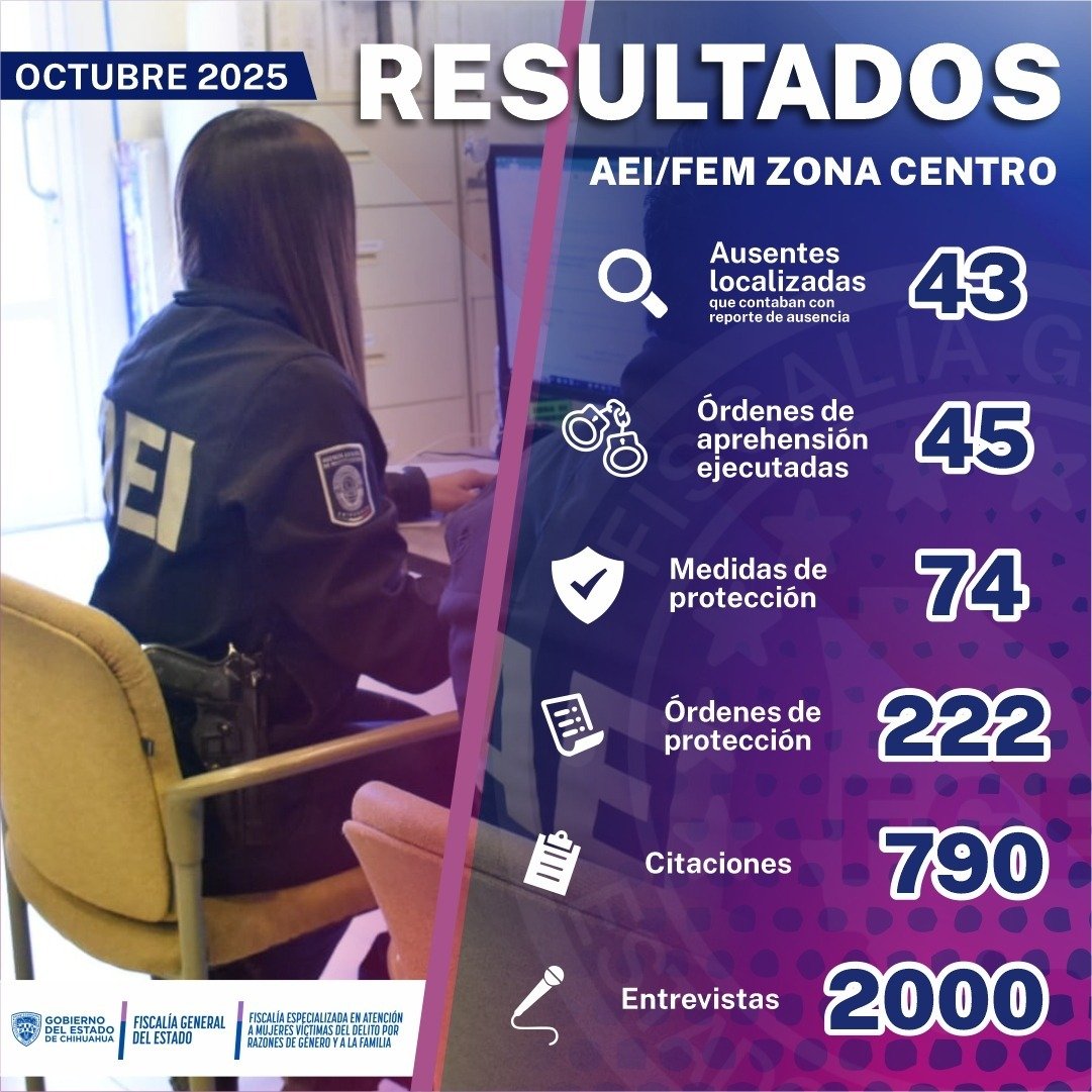 Como parte de la investigación de los delitos de género en la ciudad de Chihuahua, elementos de la Agencia Estatal de Investigación (AEI), cumplimentaron 45 órdenes de aprehensión en contra de presuntos responsables, durante el mes de octubre que acaba de concluir.