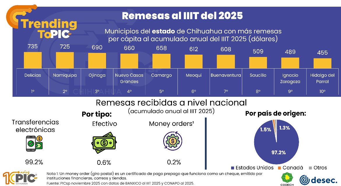 También, se indicó que el primer lugar en este sentido fue Delicias con 735 dólares; en segundo sitio estuvo Namiquipa con 725 dólares; y en la tercera posición Ojinaga con 690 dólares. Posteriormente, Nuevo Casas Grandes, Camargo, Meoqui, Buenaventura, Saucillo, Ignacio Zaragoza, e Hidalgo del Parral siendo el 99.2 por ciento por transparencia electrónica; ; el 0.6 por ciento en efectivo; y el 0.2 % por money orders.