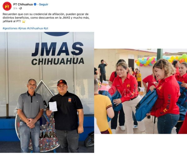 A través de redes sociales del PT Chihuahua informa, “Recuerden que con su credencial de afiliación, pueden gozar de distintos beneficios, como descuentos en la JMAS y mucho más, ¡afiliaré al PT!”