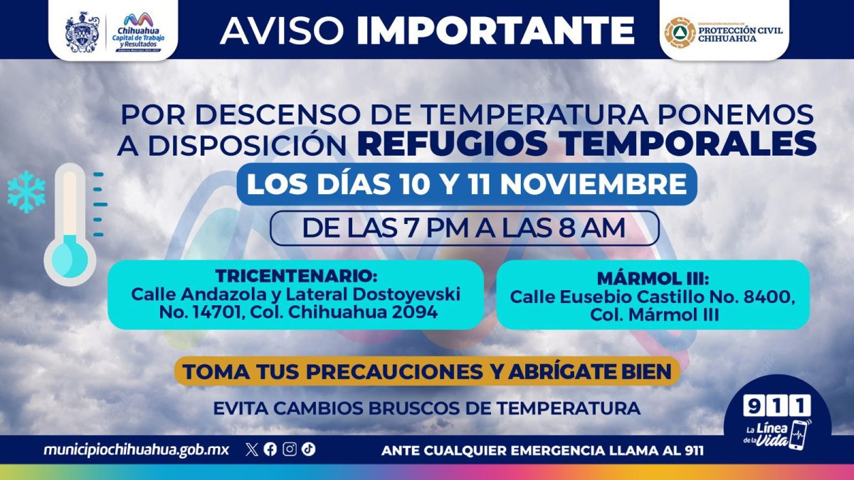 H. Ciudad de Chihuahua, Chih., a 10 de noviembre de 2025.- Debido al pronóstico de bajas temperaturas a partir de hoy por la tarde, el Gobierno Municipal a través del DIF Municipal, abrirá las puertas de los dos refugios temporales ubicados en la colonia Mármol III y en el Tricentenario, a partir de las 19:00 horas y hasta las 8:00 de la mañana del día siguiente.