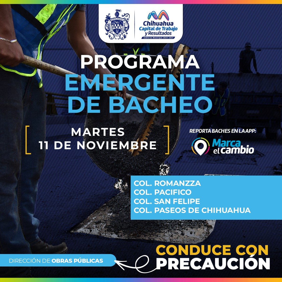 El Gobierno Municipal, a través de la Dirección de Obras Públicas, realizará trabajos de bacheo este 11 de noviembre, mediante el programa emergente en calles de las colonias: Romanzza, Pacifico, San Felipe y Paseos de Chihuahua.