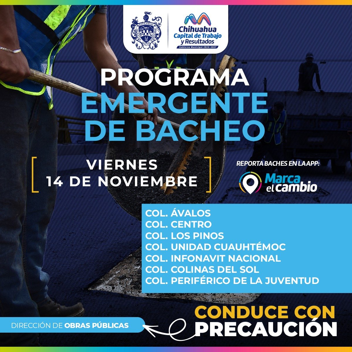 El Gobierno Municipal, a través de la Dirección de Obras Públicas, realizará trabajos de bacheo este 14 de noviembre, mediante el programa emergente en calles de las colonias: Ávalos, Centro, Los Pinos, Unidad Cuauhtémoc, Infonavit Nacional, Colinas del Sol, así como en el Periférico de la Juventud.